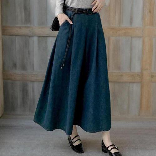 [신상오픈런]여성 핀턱 롱 청치마 뒷밴드 꽈배기 벨트 플레어 스커트