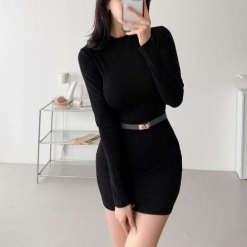 [신상오픈런]여성 슬림핏 긴팔 미니 원피스 벨트 클래식 반목 드레스
