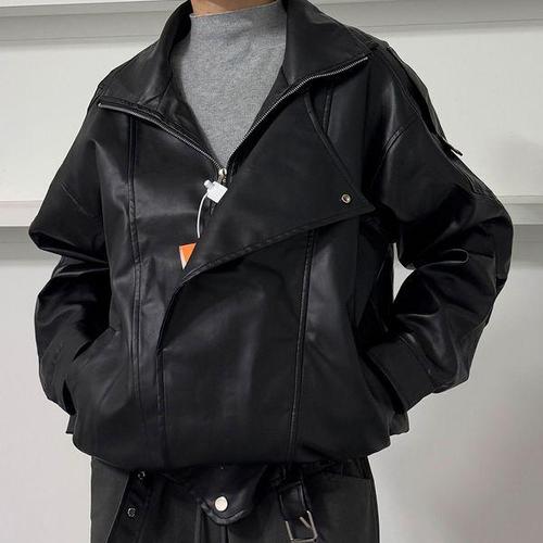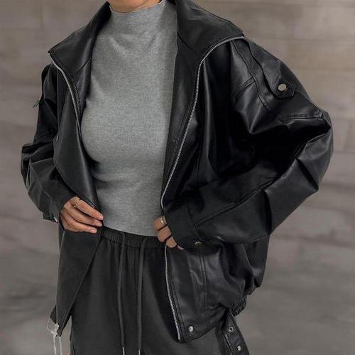 [신상오픈런]여성 오버사이즈 가죽 자켓 벨트 장착 라이더 스타일 블랙
