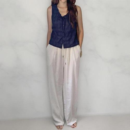 여성 슬리브리스 레이온 스트랩 코튼 격자 탑