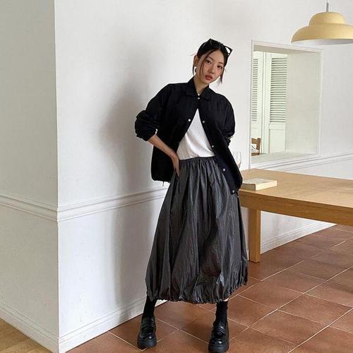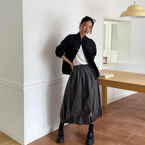 [옷자락] 여자 허리밴딩 폴리쉬 코팅 레더 펌킨핏 롱스커트