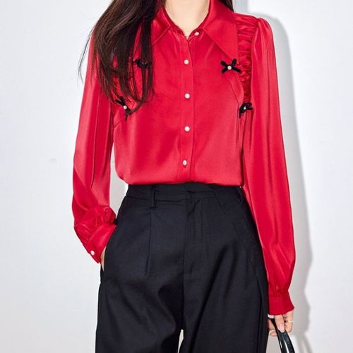 제로투올샵2 / 여성 프릴 블라우스 레이스 주름 셔츠 레드 M