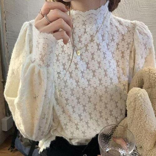 여성 러블리 이너티 반목티 레이어드 레이스 블라우스 망사 티셔츠 러플넥 벌룬