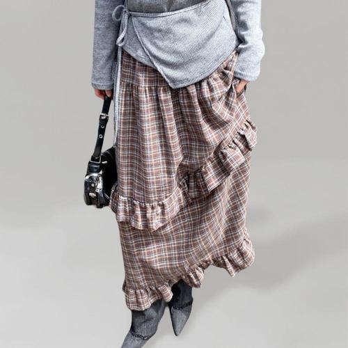 [다잇템]여성 프릴 미세 캐쥬얼 후레아 격자 롱 치마