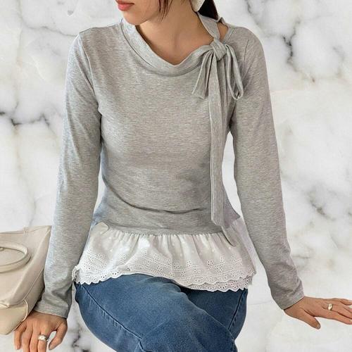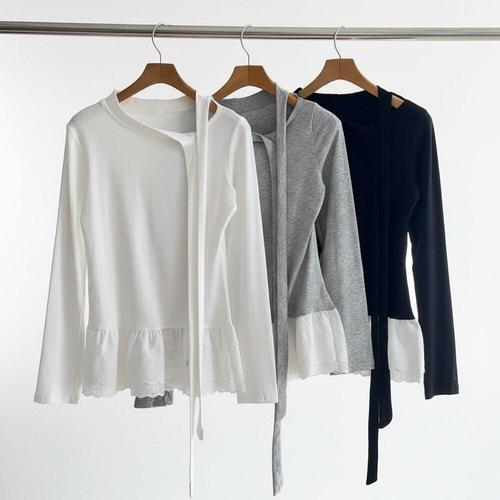 [셀러허브_여성트랜드패션]여성 롱슬리브 리본 레이스 슬림핏 티셔츠
