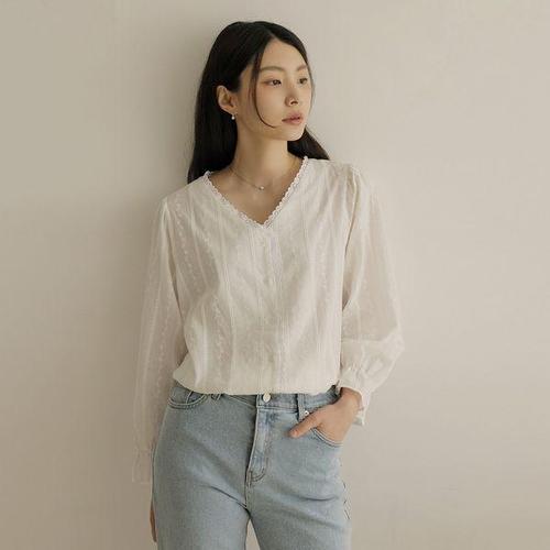 [에이비에프지]플라워 자수 포인트 긴팔 면 레이스 블라우스APY3HB43I