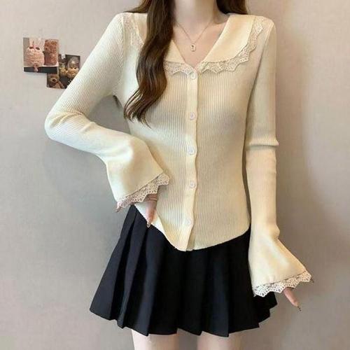 옷자락 / 여성 레이스 타이 셔링 포인트 슬림 긴팔 티
