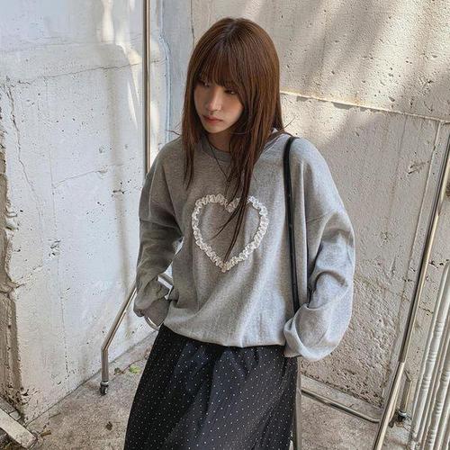 [옷자락]여자 키치무드 레이스 하트 루즈핏 면혼방 맨투맨