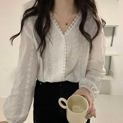 [셀러허브_여성트랜드패션]ONM 화이트 펀칭 자수 레이스 브이넥 긴팔 셔링 블라