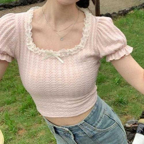[셀러허브_여성트랜드패션]ONM 여리여리핏 펀칭 짜임 레이스 크롭 반팔티 데이트