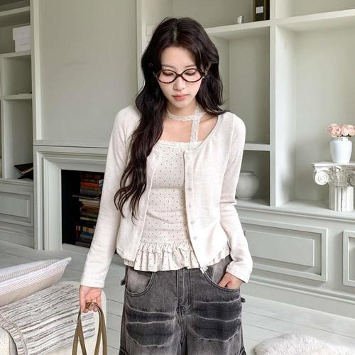 [옷자락]여성 레이스 초커넥 도트 프릴 레이어드 가디건