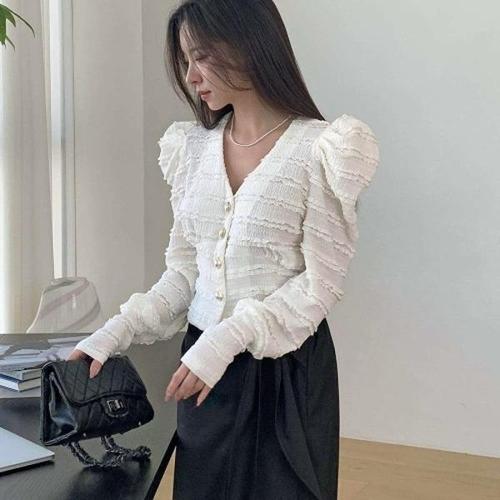 [다잇템]여자 벌룬 프릴 금장버튼 트위드 베이직 가디건