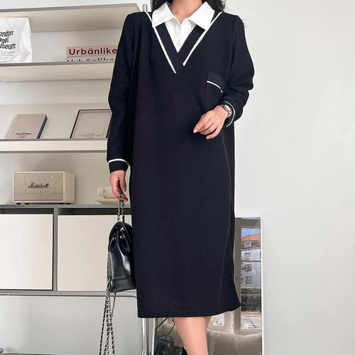 옷자락 / 여자 셔츠레이어드 배색 포켓 브이넥 기모 롱원피스
