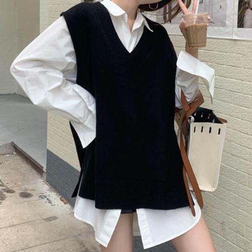 여자 레이어드 조끼 옆트임 롱 오버핏 브이넥 베스트 니트조끼 여자니트조끼 여성니트조끼 레이어드조끼 레