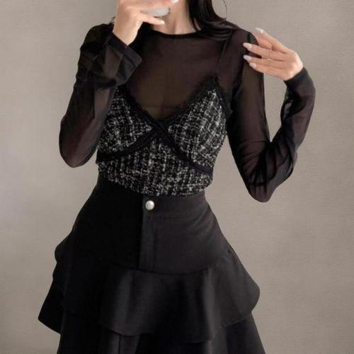 [신상오픈런]여성 시스루 레이어드 긴팔 라운드넥 티셔츠 여리핏