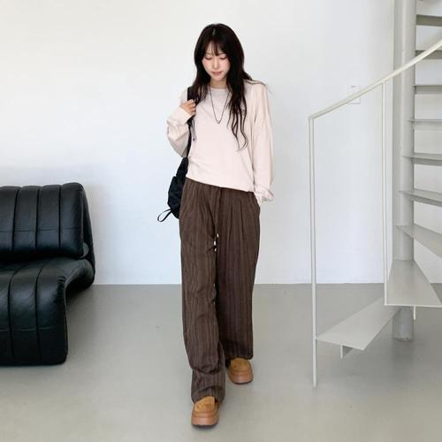 [옷자락] 여자 클래식 세로줄지 레이온 와이드 밴딩 팬츠
