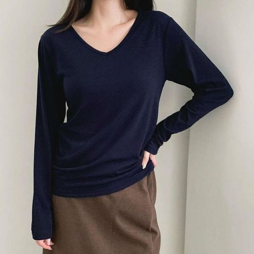 [미라클세븐]여성 포근 기모 레이온 브이넥 스판 긴팔 티셔츠