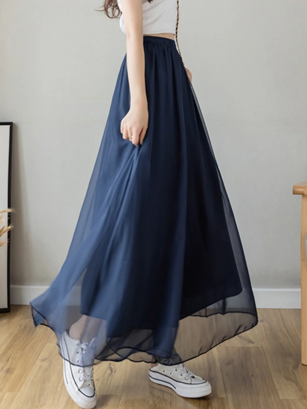 봄 여름 얇은 쉬폰 와이드 레그 팬츠 여성용 하이웨이스트 드레이프 나인 포인트 스커트 루즈 엘라스틱 하이웨이스트 플러스 사이즈 팬츠