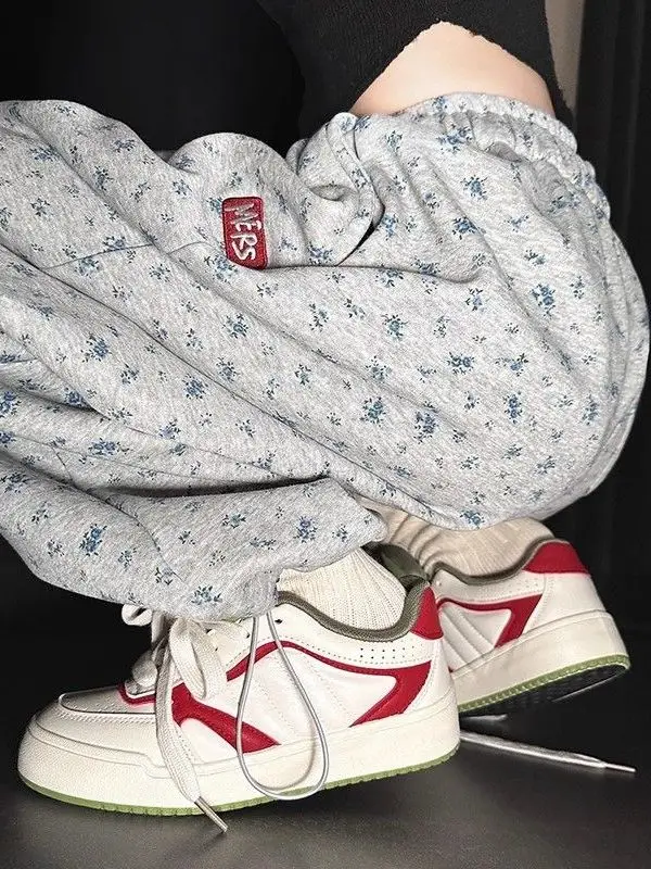 미국 스타일 그레이 플로럴 프린트 커브드 나이프 스포츠 스웨트팬츠 여성용 봄 가을 루즈 드레이프 스트레이트 레그 캐주얼 팬츠