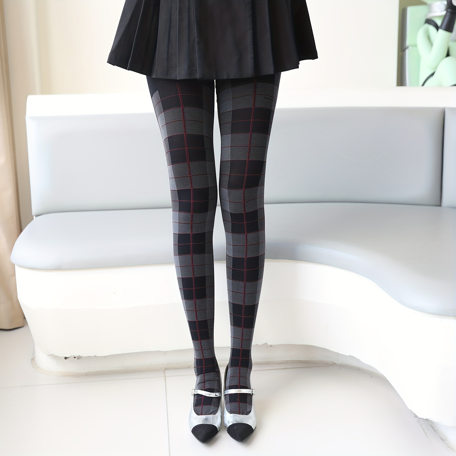 TEMU 1쌍 여성용 그레이 레드 블랙 체크 타이츠 - 레트로 브리티시 스타일, 고탄력 & 라이트 베이지, 기하학 패턴, 대학 및 공식 복장에 완벽, 쉬운 스타일링, 다리 길이 조절 가능, 클래식 디자인, 내구성 있는 소재