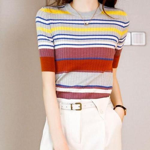 [셀러허브_여성트랜드패션]ONM 여성 심플 데일리 레인보우 니트 티셔츠