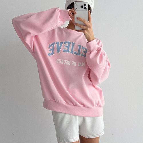 [미라클세븐]여성 봄 시즌 오버핏 레터링 배색 분홍색 맨투맨 티셔츠
