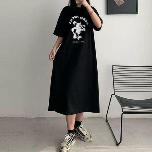 [오너클랜]인기상품 여성용 블랙 오버핏 반팔 롱 드레스 곰 캐릭터 레터링 원피스 [WFLL86N_260304]