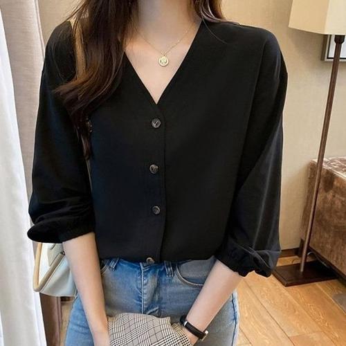 [엄지척]브이넥 블라우스 코튼 심플 긴팔 블라우스_19660147_667501