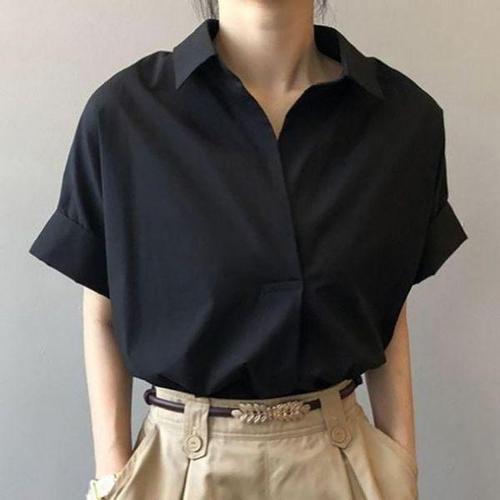 [에이치플러스몰]클래식오픈카라 박시핏 솔리드 5부반팔 셔츠블라우스