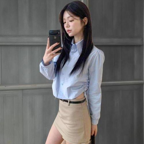 [신상오픈런]여성 스트링 사이드 셔링 카라 긴팔 크롭 셔츠