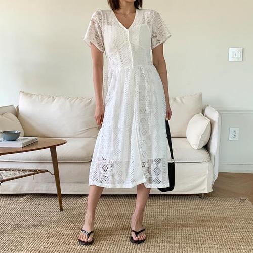 [리엘라]젤렌스 끈나시 원피스 레이스 반팔 로브 세트