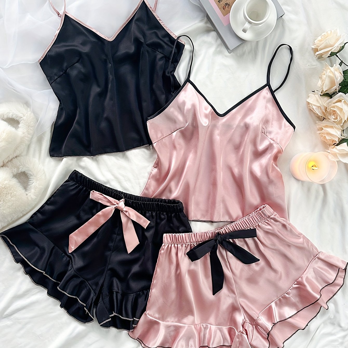 TEMU 여성용 V넥 캐미솔 러플 쇼츠 세트, 네 피스