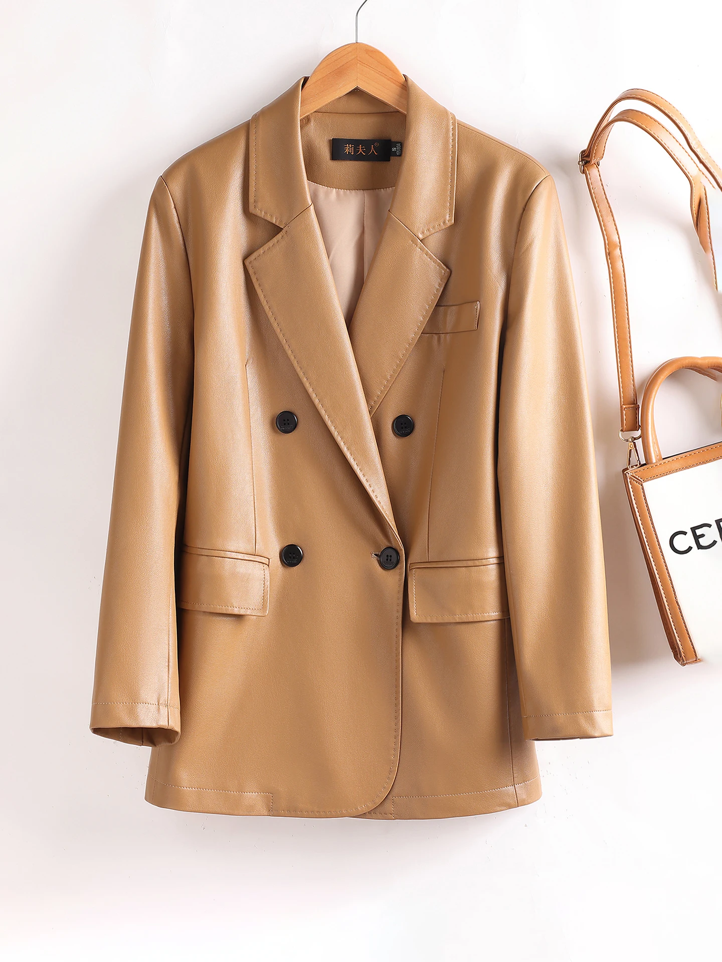 정품 양가죽 가죽 자켓 긴팔 버튼 장식 통근 스타일 루즈핏 럭셔리 캐주얼 슬리밍 아우터웨어