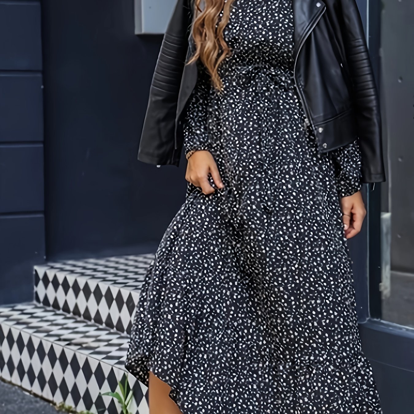 TEMU 디지 랄 프린트 크루 넥 드레스, 휴가용 넥 타이 롱 슬리브 드레스 봄 & 가을, 여성 의류