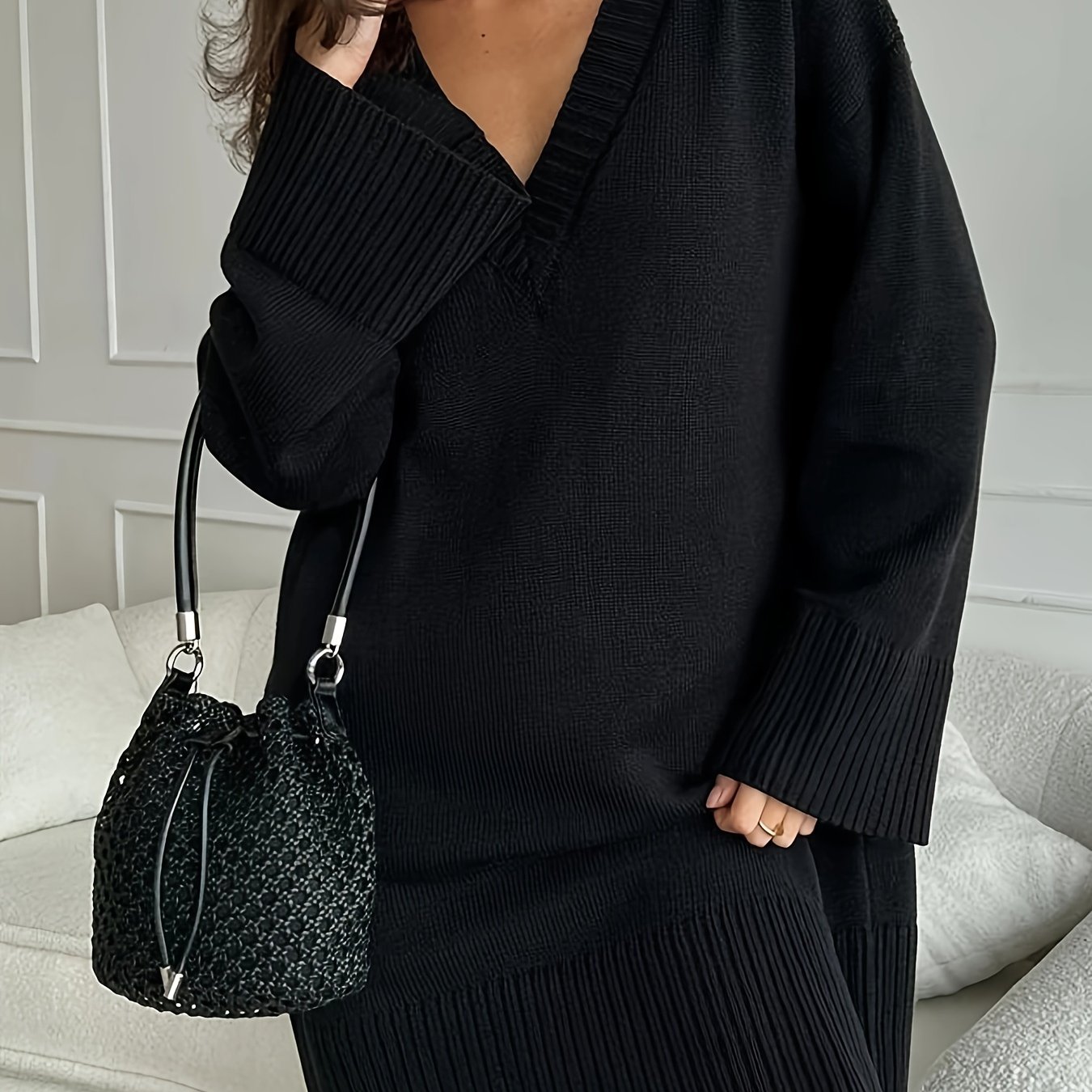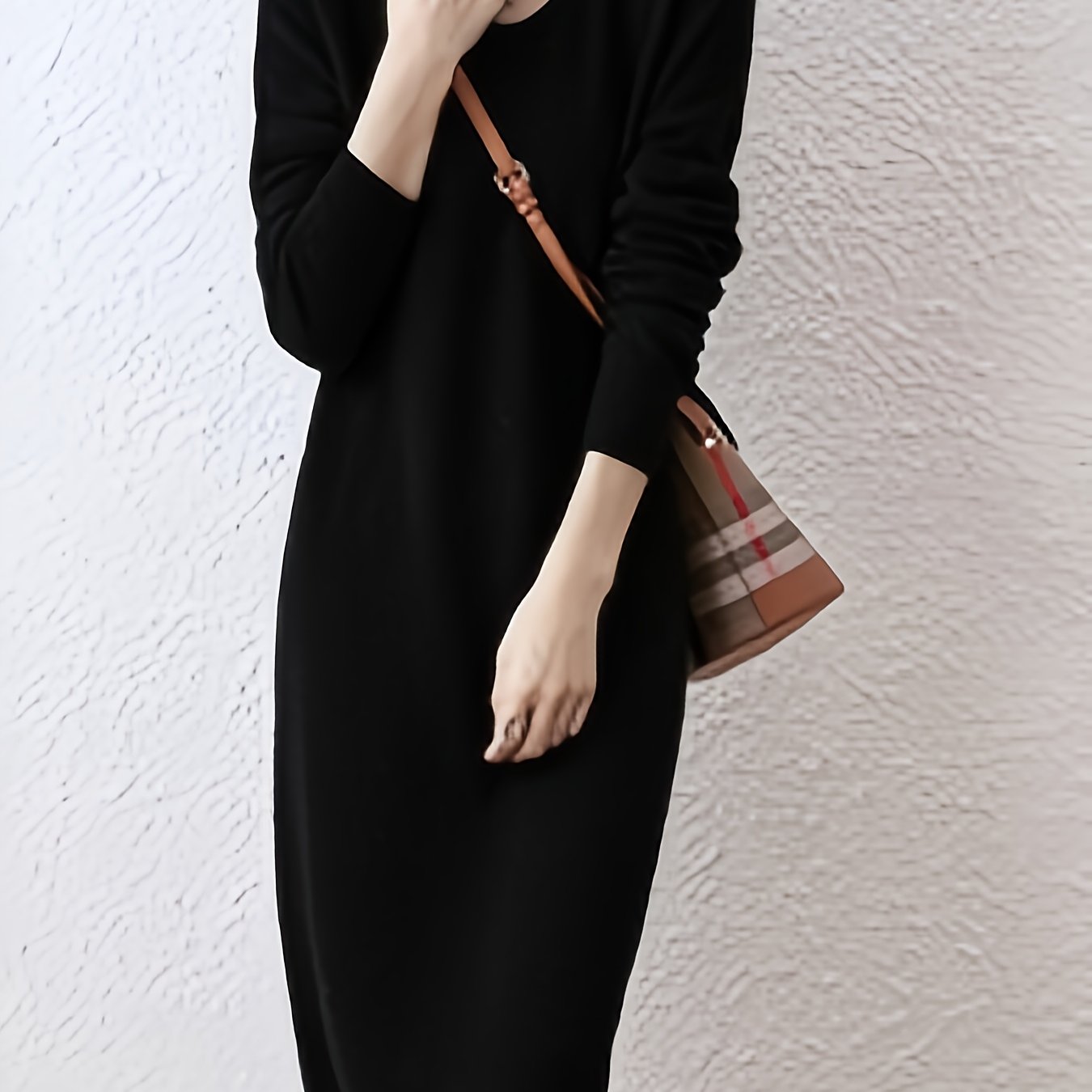 TEMU 여성용 우아한 프렌치 스타일 V넥 무릎길이 드레스 - 솔리드 컬러 스웨터 드레스, 세탁기 사용 가능한 겨울 드레스, 교회 또는 세미 포멀 이벤트용 - 포근한 가을 겨울 아웃핏