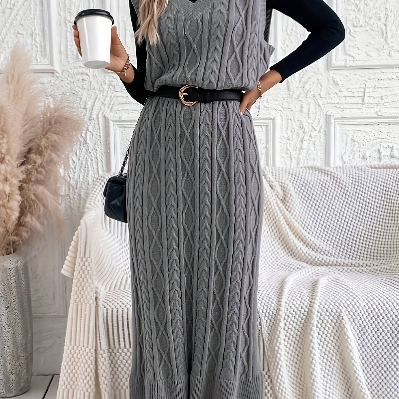 TEMU 플러스 사이즈 아일랜드 케이블 니트 스웨터 드레스, 가을과 겨울을 위한 캐주얼 V넥 드레스, 여성용 플러스 사이즈 의류