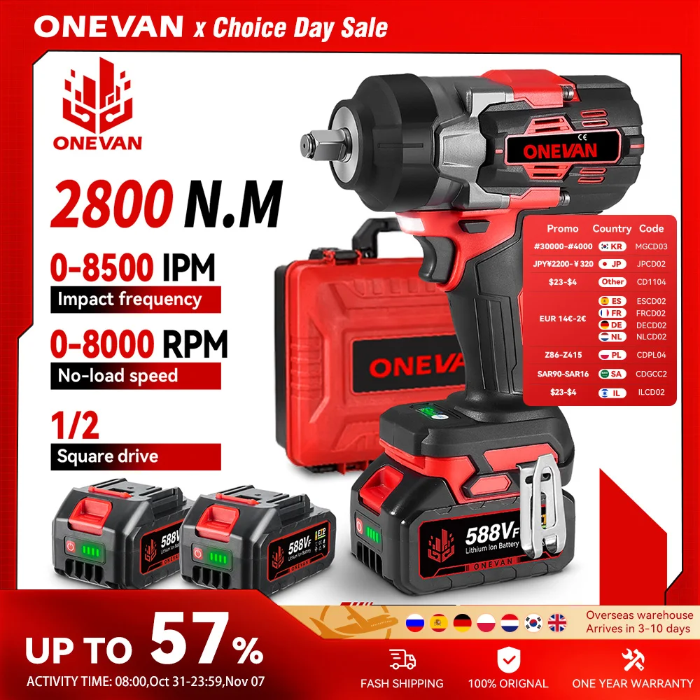 ONEVAN 2800N.M 2800W 브러시리스 전기 임팩트 렌치 1/2인치 무선 렌치 스크루드라이버 파워툴 (마키타 18V 배터리 핀용)