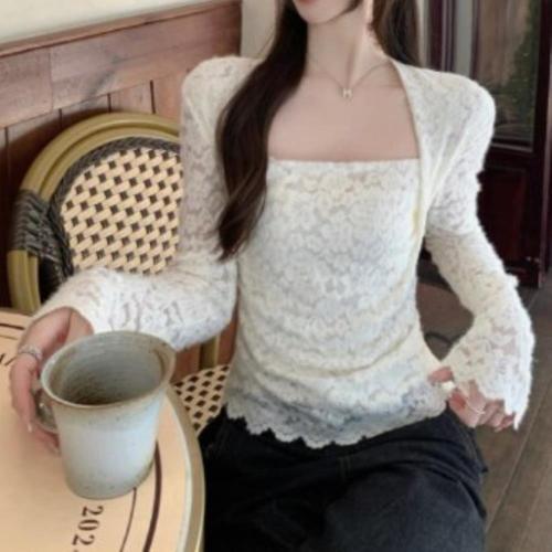 [옷자락]여성 겨울 가을 기모 레이스 롱슬리브 크롭 탑