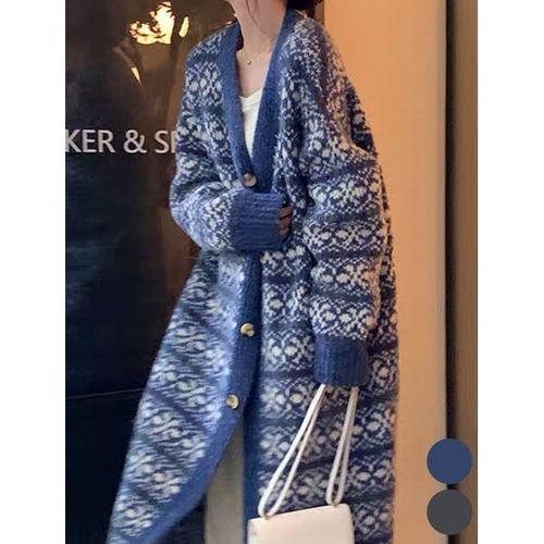 [위시드]네추럴 V넥 루즈핏 패턴 롱 니트 가디건 (WIACCD001)