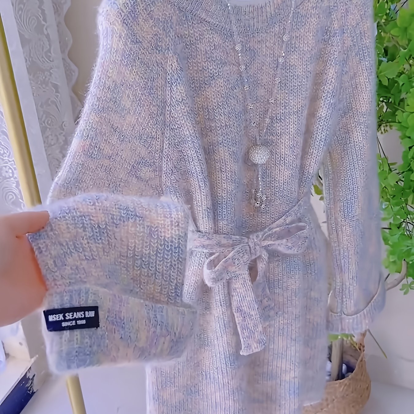 TEMU 스타일리시하고 예쁜 한국 스타일 빈티지 젠틀한 스타일의 여성용 미디 원피스, 벨트, 라운드 넥, 허리끈 디자인 포함. 가을 겨울을 위한 시크하고 고급스러운 룩을 연출하는 활용도 높은 스웨터 원피스. 여성 패션을 위한 드로스트링 허리끈이 있는 롱 원피스