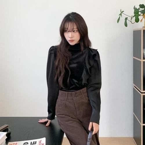 [다잇템][다잇템] 여성 벨루어 롱슬리브 프릴 옆면 폴리울 모크넥 블라우스_24094861_588872