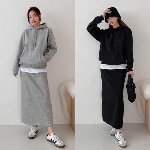 [유야]여성 기모 레이어드 후드티 H라인 롱스커트 세트 -FSST0062- 겨울