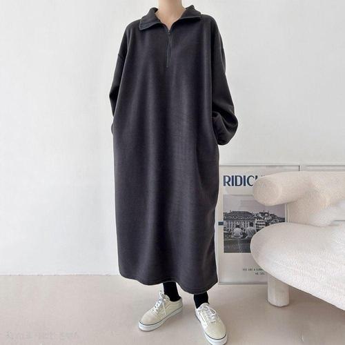 TIMEPURE 가을겨울 여성 심플 오버핏 후드 긴팔 미디엄 기장 플리스 롱 후디 집업 롱 자켓 후드 롱 원피스