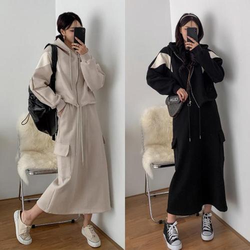 [유야]여성 기모 면 후드집업 카고 롱스커트 세트 -FSST0053- 겨울