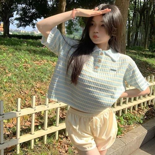 [주식회사 브이와이][JHQRV0J6_4A]여성 반팔 오버핏티셔츠 러블리 단가라 니트 (22632561A)