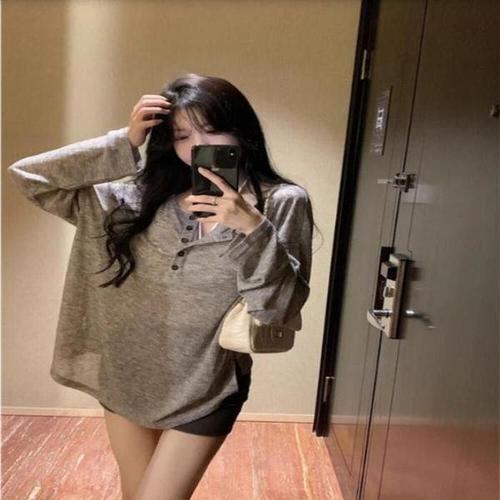 [옷자락]여성 키치무드 오버핏 시스루 오픈 단추 롱 긴팔티