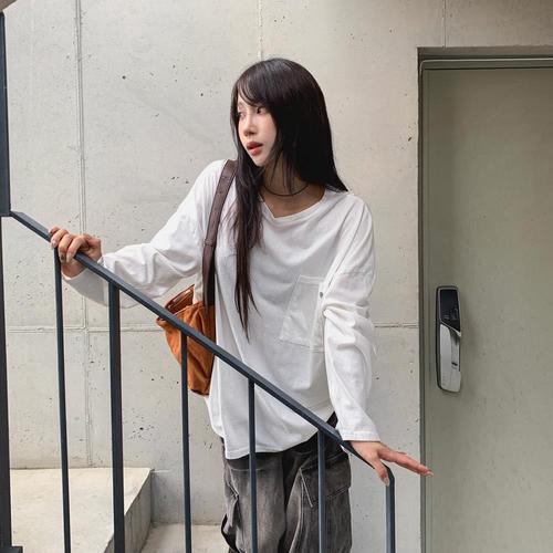 [옷자락] 여성 무지컬러 캐주얼 루즈핏 포켓 롱 워싱 긴팔티