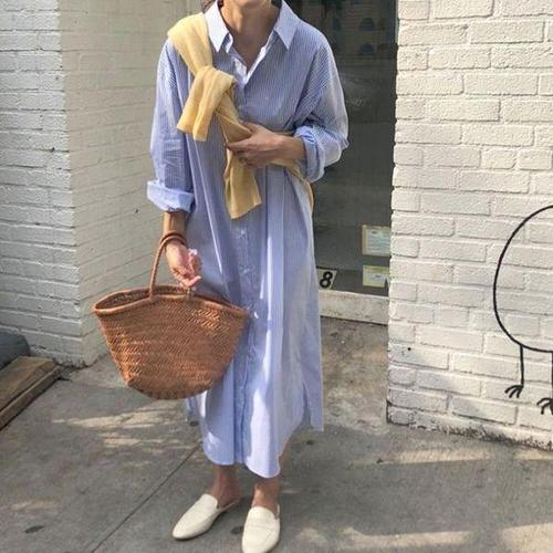 글램핏 / 스트라이프 루즈핏 셔츠 긴팔 간절기 롱 원피스 2컬러