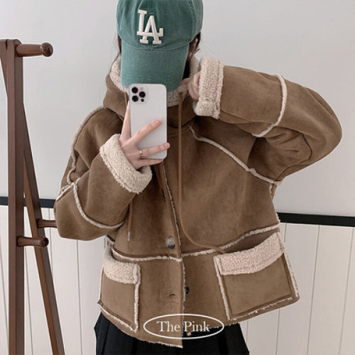 더핑크 / 퍼룬 오버핏 양털 뽀글이 후드 무스탕 자켓