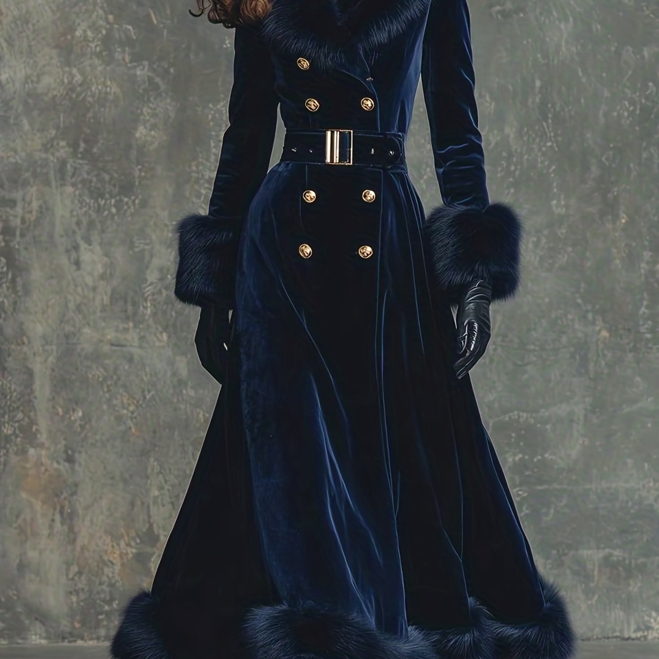 TEMU 여성용 우아한 빈티지 네이비 블루 따뜻한 코트 | 더블 브레스티드 롱 코트, 플러시 칼라, 허리 강조 핏|빈티지